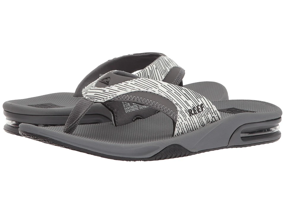 Kick back open a cold one and enjoy the scenic ocean views with the relaxed styling and dependable design of these Fanning Prints from Reef. These Reef flip flops sport a comfortable water friendly synthetic nubuck upper. Contoured compression molded EVA footbed with anatomical arch support. Full 360° heel airbag enclosed in soft polyurethane. Church key to open your soda bottle. Durable rubber outsole. Measurements: Weight: 9. 5 oz Product measurements were taken using size 12 width D – Medium. Please note that measurements may vary by size. Weight of footwear is based on a single item not a pair.